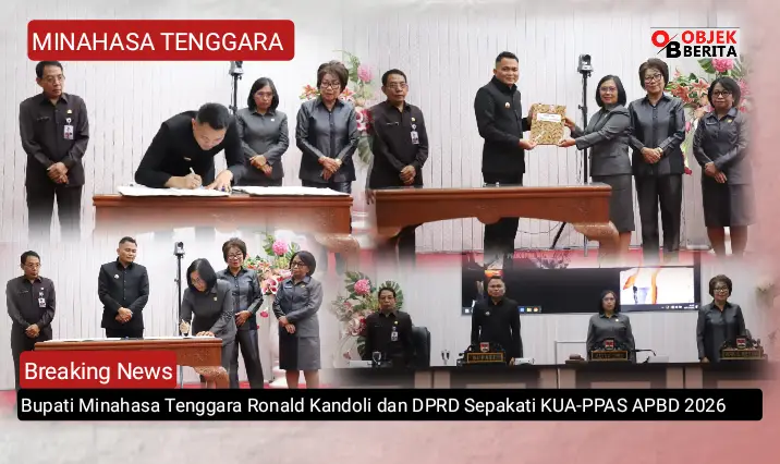 MITRA, ObjekBerita.id- Bupati Minahasa Tenggara, Ronald Kandoli, bersama Pimpinan DPRD Minahasa Tenggara (Mitra), melakukan Penandatanganan Nota Kesepakatan atas Rancangan Kebijakan Umum APBD (KUA) dan Rancangan Prioritas dan Plafon Anggaran Sementara (PPAS) APBD TA 2026 pada Rapat Paripurna DPRD di Soekarno Legislatif Hall Ratahan Kamis, 06/11/2025