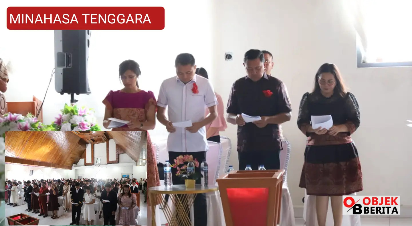 MITRA, ObjekBerita.id – Bupati Minahasa Tenggara (Mitra), Ronald Kandoli, dan Ketua TP PKK, Ny. Stefa Kandoli Antou, bersama Wakil Bupati, Fredy Tuda, dan Wakil Ketua TP PKK, Ny. Sandra Tuda Kindangen, beribadah bersama Jemaat GMIM Sion Lowu Wilayah Tombatu Barat dalam rangka pengucapan syukur jemaat dan peneguhan pernikahan bagi 27 pasang peserta kawin masal pada Minggu, 19 Oktober 2025.