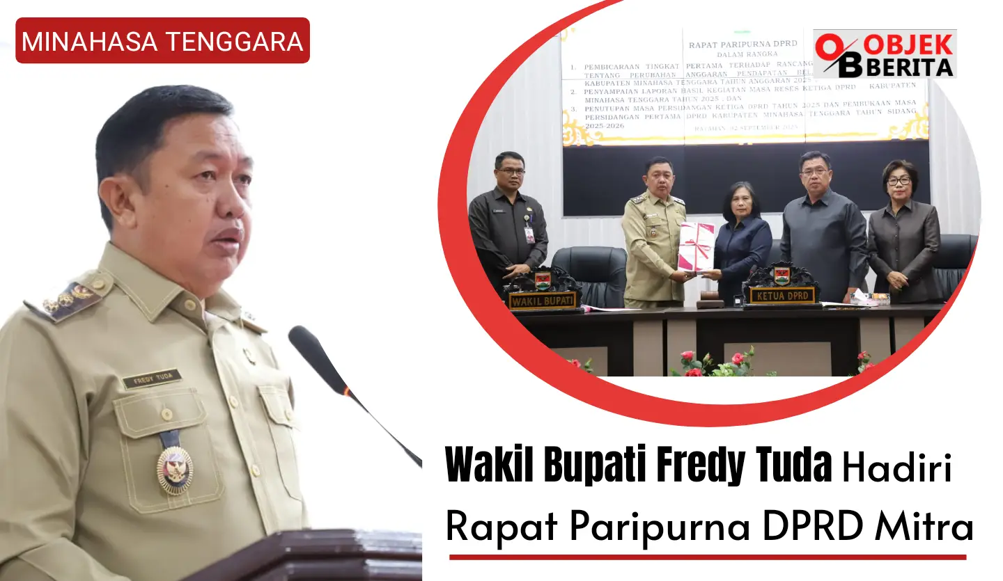 MITRA, ObjekBerita.id – Wakil Bupati Minahasa Tenggara, Fredy Tuda, mewakili Bupati Ronald Kandoli menghadiri Rapat Paripurna Dewan Perwakilan Rakyat Daerah (DPRD) Minahasa Tenggara pada Selasa, 2 September 2025 di Soekarno Legislatif Hall Ratahan.