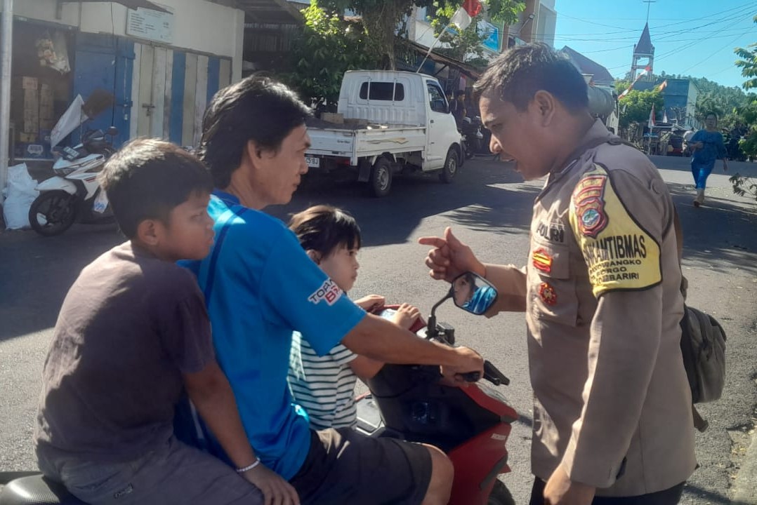 Bhabinkamtibmas BRIPKA Gustaf Kalalo, saat mendapati warga yang tidak menggunakan helm saat berboncengan mengendarai sepeda motor.