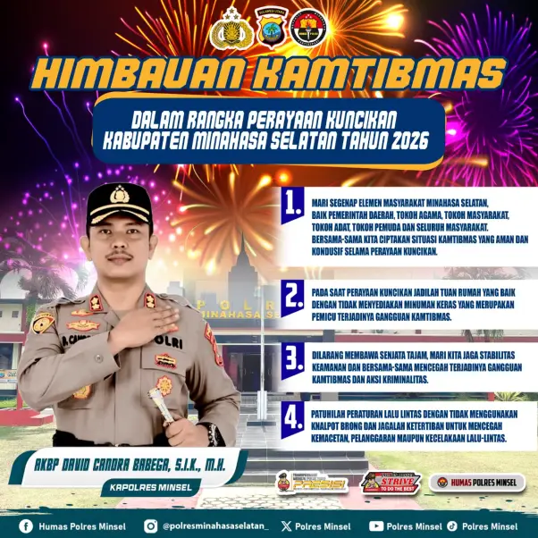 Kapolres Minsel, AKBP David Candra Babega, S.I.K., M.H., secara resmi mengeluarkan imbauan Kamtibmas (Keamanan dan Ketertiban Masyarakat) bagi seluruh warga Kabupaten Minahasa Selatan.