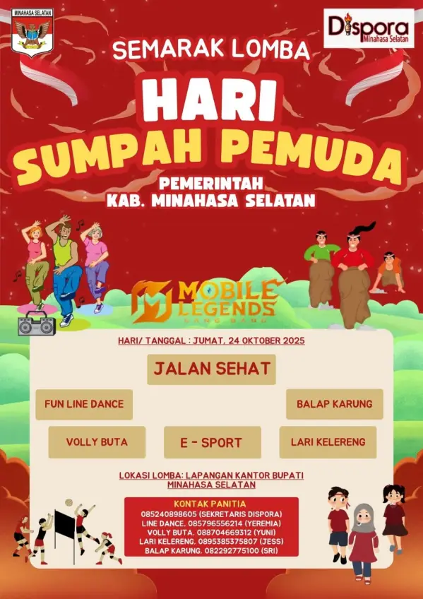 Rangkaian acara bertajuk “Semarak Lomba Hari Sumpah Pemuda” ini dijadwalkan berlangsung pada Jumat, 24 Oktober 2025, bertempat di Lapangan Kantor Bupati Minahasa Selatan.
