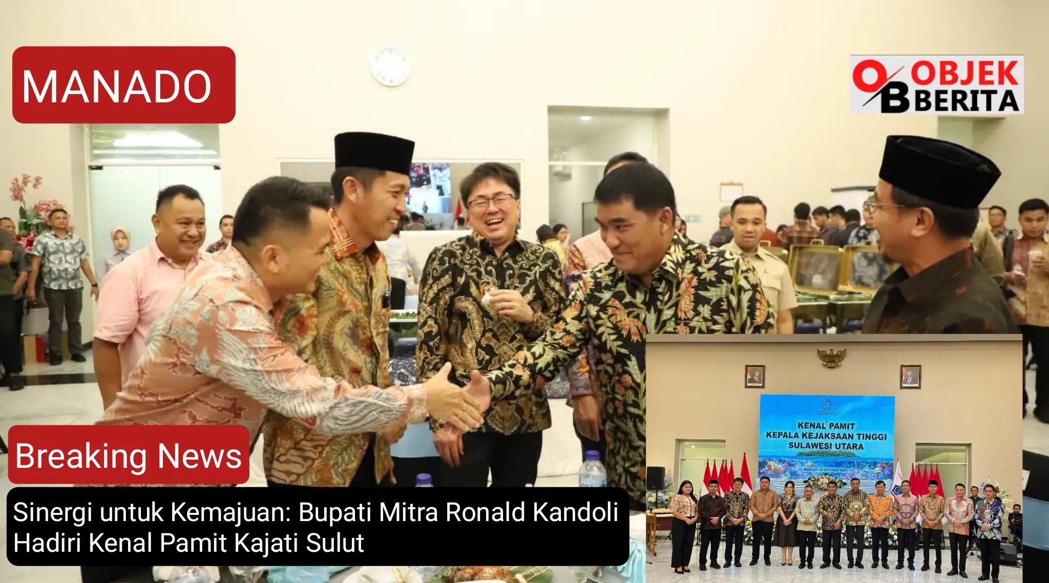 MANADO, ObjekBerita.id – Bupati Minahasa Tenggara, Ronald Kandoli, menghadiri acara Kenal Pamit Kepala Kejaksaan Tinggi Sulawesi Utara yang lama, Dr. Andi Muhammad Taufik, SH., MH., CGCAE, dan Kepala Kejaksaan Tinggi Sulawesi Utara yang baru, Jacob Hendrik Pattipeilohy, S.H., M.H.